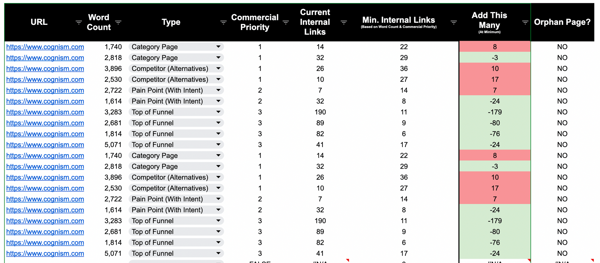 The template will help you identify pages with poor internal links and suggest how many internal links it should have.